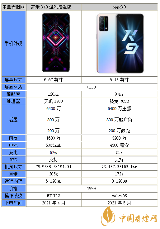 以上就是小編收集到的oppok9和紅米k40游戲增強(qiáng)版買哪個(gè)-參數(shù)性能對(duì)比的相關(guān)內(nèi)容,以上內(nèi)容均來源于網(wǎng)絡(luò),僅供參考,一切以實(shí)際為準(zhǔn),更多最新數(shù)碼資訊請(qǐng)關(guān)注香煙網(wǎng)。