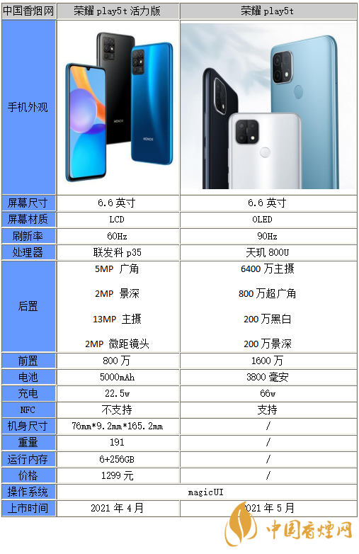 以上就是小編收集到的榮耀play5和榮耀play5t活力版區(qū)別在哪-參數(shù)性能分析的相關(guān)內(nèi)容,以上內(nèi)容均來(lái)源于網(wǎng)絡(luò),僅供參考,一切以實(shí)際為準(zhǔn),更多最新數(shù)碼資訊請(qǐng)關(guān)注香煙網(wǎng)。