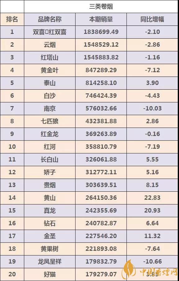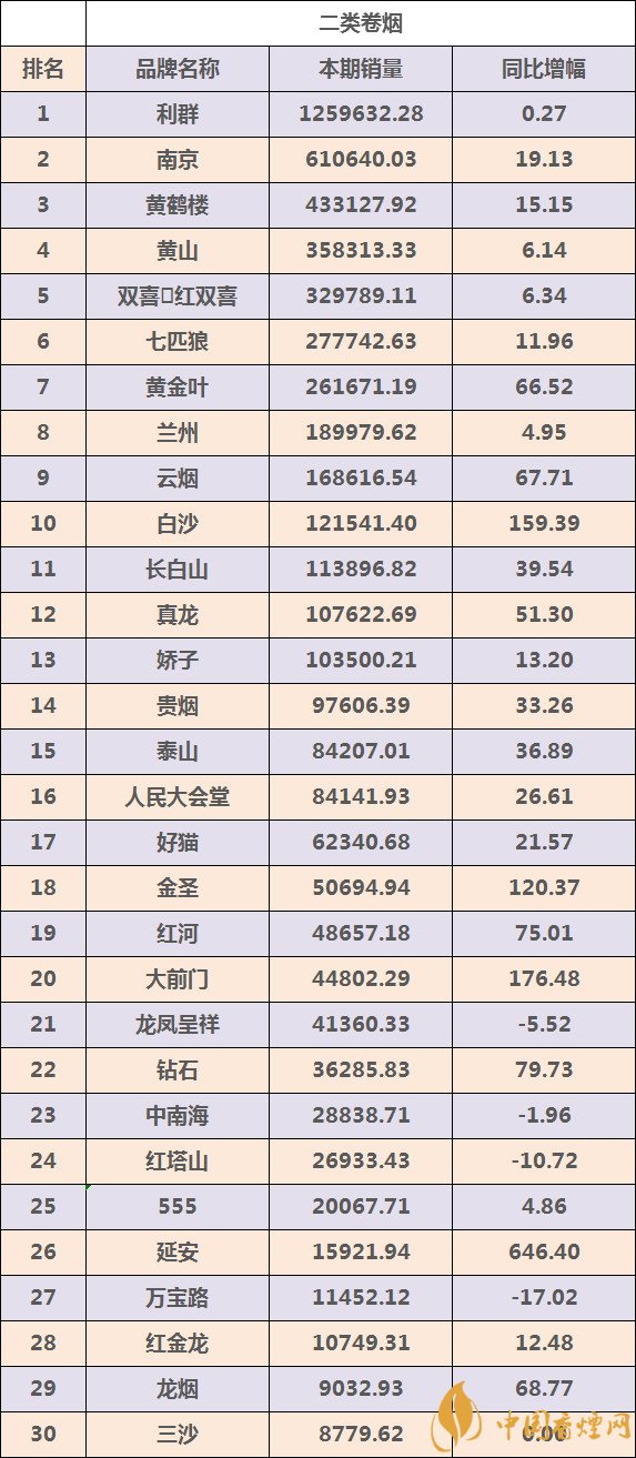 2018年煙草行業(yè)都在全力推動(dòng)煙草行業(yè)高質(zhì)量發(fā)展,奮力把煙草行業(yè)各項(xiàng)工作推上一個(gè)新臺(tái)階。煙草行業(yè)在改革發(fā)展過(guò)程中“高質(zhì)量發(fā)展”成為重中之重,而在此過(guò)程中消費(fèi)升級(jí)環(huán)境下的“結(jié)構(gòu)提升”更顯作用突出。那么大家最關(guān)心的卷煙品牌銷(xiāo)量情況如何呢?下面就由香煙網(wǎng)小編帶大家一起來(lái)了解一類(lèi)煙卷煙品牌TOP30強(qiáng)的基本情況: