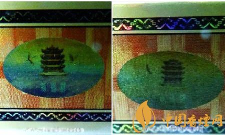 小盒商標(biāo)紙側(cè)邊雙重全息定位燙技術(shù)差異比對:真品小盒側(cè)邊雙重全息定位燙技術(shù)的圖案由黃鶴樓實(shí)景照及黃鶴樓三個燙金字組合,切換不同角度會呈現(xiàn)出清晰較高全景圖案;假煙定位燙圖案多采用照相等仿造技術(shù),無論如何切換不同角度都不能完整性呈現(xiàn)清晰圖案,與真品呈現(xiàn)效果差異明顯。