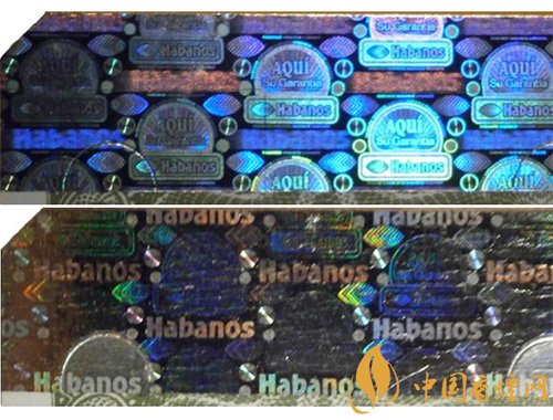 2013前的激光標(biāo),圓圈內(nèi)AQUI字樣清晰可見,方框內(nèi)Habanos字樣相對(duì)較小。而2013后的激光標(biāo),圓圈內(nèi)的AQUI字樣基本上已經(jīng)模糊不可見,而Habanos字樣則變得更大更清晰。