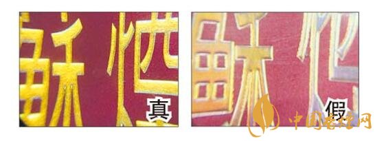 真煙燙金字體線條清晰、不漏金,金色部分成色純正;假煙燙金字體線條不清晰,有漏金現(xiàn)象,金色部分成色暗淡。