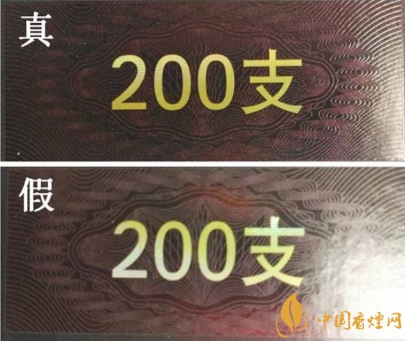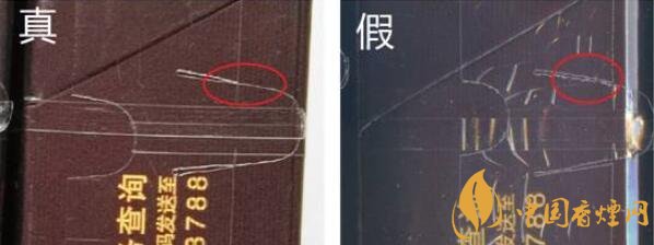 真煙條盒側(cè)面,小盒頂部均采用與人民幣相同效果的鈔線防偽技術(shù),由無數(shù)根交叉防偽細線編織在一起,油墨厚,交叉線條根根清晰完整無缺,線條錯中有序,立體感強。假煙采用掃描復(fù)制技術(shù),其交叉線條清晰度差,無立體感,與真品防偽技術(shù)存在明顯差異。