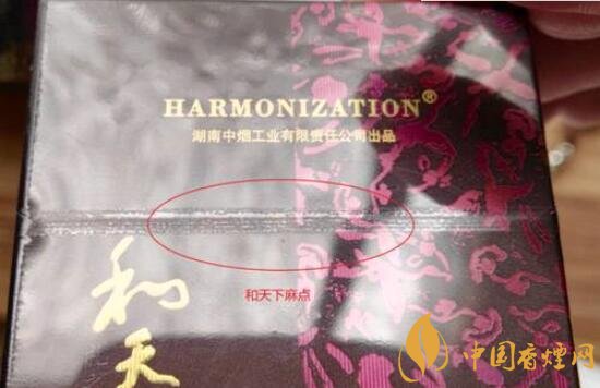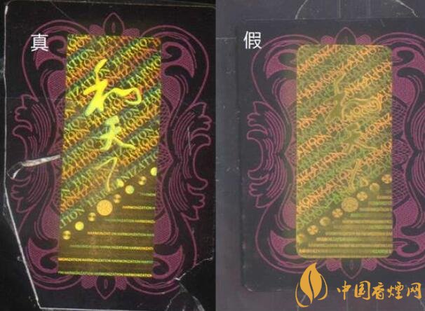真煙“和天下”立體感強,字體筆畫較粗用放大鏡看“HARMONIZATION”微縮字較清晰;假煙的全息防偽無立體感,用放大鏡看“HARMONIZATION”微縮字較模糊,且“和天下”字體筆畫較細,與真品特征存在明顯差異。