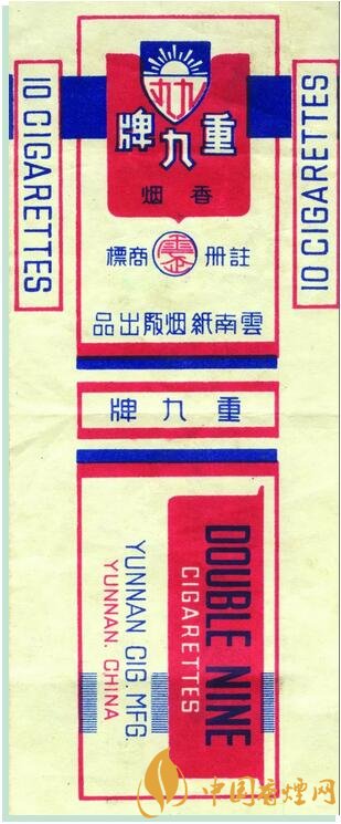 1945年,云南紙煙廠出品。創(chuàng)牌于1922年,為紀(jì)念護(hù)國名將蔡鍔等所領(lǐng)導(dǎo)的“重九起義”而創(chuàng)牌,重九牌歷史悠久,具有豐富的文化內(nèi)涵,是云南紙煙廠的榮譽(yù)產(chǎn)品。該牌號卷煙僅生產(chǎn)13.85箱,屬罕見珍貴煙標(biāo),具有歷史文物價(jià)值。1945年6月1日云南紙煙廠在昆明金碧日報(bào)刊登“重九”牌更換商標(biāo)紙盒啟示 , 以此啟示為證改寫了此枚珍貴歷史商標(biāo)的確切生產(chǎn)時(shí)間。
