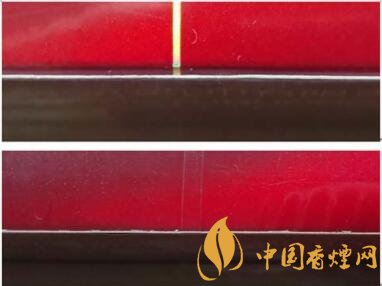 真品卷煙商標(biāo)紙邊緣裁切干凈、光清,無毛邊。該款假冒卷煙商標(biāo)紙邊緣裁切粗糙,毛邊多。圖6上真下假