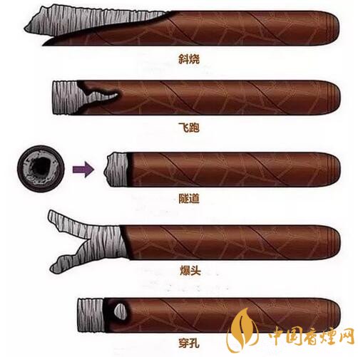 我們抽雪茄的時(shí)候經(jīng)常會(huì)發(fā)現(xiàn)雪茄燃燒出現(xiàn)各種問題,這種問題我們可以稱作是雪茄的不完美燃燒,雪茄的不完美燃燒是日常抽雪茄經(jīng)常會(huì)遇到的。這張圖就展示了我們抽雪茄中經(jīng)常會(huì)遇到的問題。