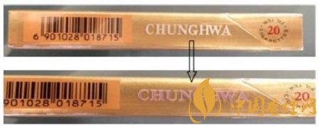 “中華”(雙中支)產(chǎn)品小盒采用硬盒(雙包)翻蓋的包裝形式,煙支規(guī)格為89mm(長)*20mm(圓周)。小盒側(cè)面英文字母“CHUNGHWA”采用熒光變色防偽油墨;在紫外光照下,白色“CHUNGHWA”會變成紫紅色,一段時間后紫紅色褪去。