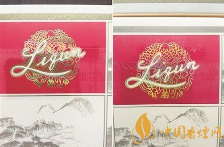 商標(biāo)紙印刷工藝差異對(duì)比:真煙“Liqun”字母以及花球的圖案清晰,線條清晰飽滿,立體感較強(qiáng)。假煙圖案整體較為模糊,字體不飽滿,邊緣不清晰,無立體感。