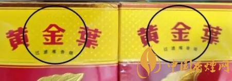 1、正面“黃金葉”圖案:真煙套印準(zhǔn)確,燙金飽滿,色澤鮮亮,圖案生動(dòng),立體感強(qiáng)。假煙燙金套印容易出現(xiàn)錯(cuò)位,燙金處會(huì)出現(xiàn)漏金現(xiàn)象,顏色相較真煙暗沉,立體感差。(左真右假)