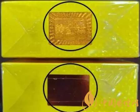 3、煙盒頂部防偽標(biāo)識(shí):真煙在不同角度可見黃金葉文字與圖案相互變換。假煙未能顯現(xiàn)真煙防偽標(biāo)識(shí)的效果,或者文字與圖案層疊無(wú)法清晰分離。(上真下假)