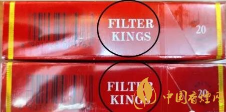 2、側(cè)面英文“FILTER KINGS”:用紫外燈照射真煙“FILTER KINGS”后,移開紫外燈,照射處字體會(huì)由黑色逐漸褪色。假煙無(wú)此效果,或變色效果差。(上真下假)