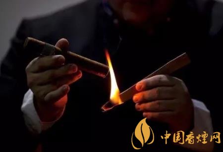 雪茄煙翻開一端(尾部)是點著的一端,不要將尾部直接放在火焰上,也不要先將雪茄放在嘴里。應(yīng)當先用手拿住雪茄,將尾部以45°角接近火源一英寸處,這么做的意圖是為了預(yù)熱或是將煙灸熱以保證雪茄能充沛、均勻的點著。在灸燒時旋轉(zhuǎn)一下雪茄,當雪茄煙尾部已均勻加熱,變得焦黑和發(fā)亮時,將雪茄置入口中。