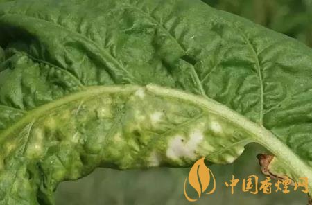 癥狀:幼嫩葉片發(fā)?。翰∪~直立;較大葉片發(fā)病:初期形成黃色圓斑,后病斑中間下陷,背面產(chǎn)生灰色或藍色霉層,嚴重時病斑融合成褐色壞死大斑,病葉皺縮扭曲。常表現(xiàn)系統(tǒng)感染,煙株矮化凋萎。在花、蒴果上也出現(xiàn)病斑。