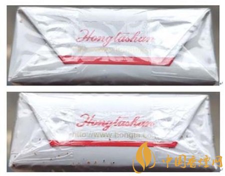 真品卷煙:1.透明紙燙封收縮均勻、自然,有烙鐵痕跡。2.商標(biāo)紙拐角折疊空隙較大。