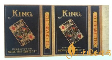 二十世紀(jì)三十年代,南洋兄弟煙草公司出品了“王牌”卷煙。這張煙標(biāo)長146MM,寬74MM。“王牌”即“KING”,撲克牌“K”牌面。該卷煙標(biāo)正版與副版的圖案一模一樣,煙標(biāo)中央向左傾斜45度的一張方塊“K”撲克牌,其上寫有大大的金色英文字母“KING”,其下為南洋兄弟煙草公司出品的英譯文。整幅煙標(biāo)沒有一個中文字,左右騎縫處則各印有紅色的“10 CIGARETTES”,即該卷煙規(guī)格為十支裝。方塊“K”牌面,就是凱撒大帝(朱利葉斯·凱撒),為羅馬共和國終生的執(zhí)政官,后出任高盧總督。四張花色的“K”牌面,南洋公司為何只取其方塊花色呢?因為在四張花色“K”中,只有這張方塊“K”為凱撒大帝手持戰(zhàn)斧的側(cè)面像,其余三張人物均為正面像??赡軓S商是為了標(biāo)新立異,從中亦能投射出其生產(chǎn)的卷煙與眾不同吧。如此設(shè)計的煙標(biāo),握于手掌,更像是拿了一副撲克牌,雌雄難辨,頗有玩味。