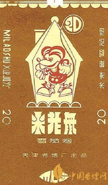 上世紀(jì)80年代,天津卷煙廠出品的“米老鼠”煙標(biāo),則為我們展示了一只卡通米老鼠的形象。該標(biāo)主副版均為長(zhǎng)著圓圓耳朵的米奇老鼠在妙妙屋中生活的畫面,其形象洋溢著美式卡通特有的調(diào)侃、樂天、嬉皮、滑稽的美國(guó)文化精神,米老鼠是有著卡通天才、娛樂業(yè)大王之稱的美國(guó)人沃爾特·迪尼斯精心打造的卡通形象。
