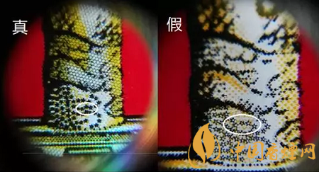 鑒別真假“中華”的關鍵在于用放大鏡查看條包兩端中英文字母的邊緣有無放射鋸齒,真“中華”的字體在放大后邊緣依然很規(guī)整,無鋸齒。假“中華”卷煙的字體在用20倍放大鏡觀察邊緣呈明顯的鋸齒狀。