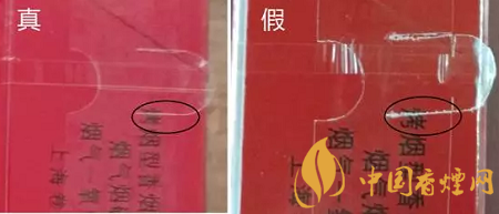真品小盒拉帶頭為方頭圓角,邊緣光滑無毛渣;假煙小盒拉帶頭形狀為平頭圓角,邊緣不夠光滑,有毛渣。