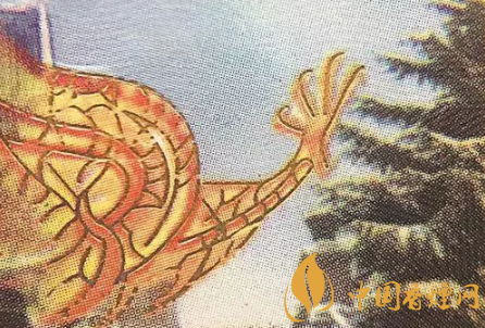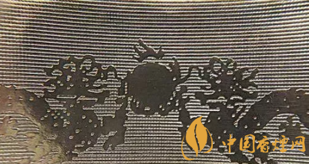 真煙小盒正面龍紋和松枝印刷清晰,色彩飽和度高,有立體感;假煙小盒正面龍紋和松枝印刷模糊,無立體感,且有粗糙圓形圖案。(上真下假)