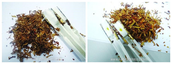 真品濾棒中添加了“香潤珠”,油潤性好切絲均勻,顏色呈現(xiàn)金黃色;假煙濾棒未添加“香潤珠”,煙絲干直切絲粗細(xì)不一,顏色呈現(xiàn)出淺褐色,與真品存在顯著差異。