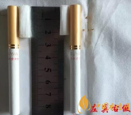 左真右假,正品香煙的煙支長(zhǎng)度為24mm,假冒的香煙長(zhǎng)度為22mm,煙支長(zhǎng)度是不一樣的。
