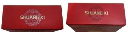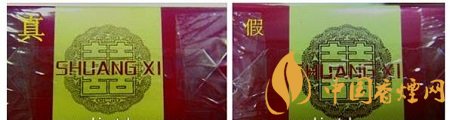 如圖所示:真品商標紙顏色為深紅色,正面喜字燙金邊緣凸起感明顯;假煙商標紙顏色多為鮮紅色,正面喜字為平版印刷且邊緣未見凸起感。(左真右假)