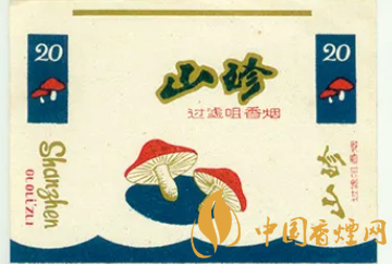 蘑菇是世界上食用菌中最大的一個(gè)菇種,因其富含的人體必需氨基酸、礦物質(zhì)、維生素和多糖等營(yíng)養(yǎng)成分,而有“植物肉”之稱。上世紀(jì)80年代,云南昭通卷煙廠出品有一枚“山珍”(圖5)煙標(biāo),該標(biāo)主版上方于藍(lán)底上,采用金色分別描繪了兩種蘑菇,以及一根春筍的畫(huà)面。