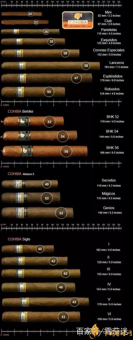 哈伯納斯旗下的 27 個(gè)古巴品牌雪茄,長度基本在 100mm-230mm 之間,環(huán)徑基本在 10.4-22.8 mm之間。