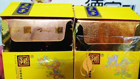 小盒商標印刷工藝差異對比:真品小盒正面套印定位燙金“飛龍”圖案鱗片清晰,從頭至尾都能看到定位燙金工藝,紅色貫穿整個龍身,“鱗片”是雪里透紅,栩栩如生;假煙套印定位燙金仿制較差,鱗片無法達到真品的印刷工藝水平,印刷工藝與真品商標圖案差異明顯。
