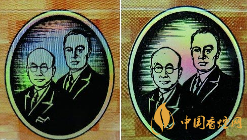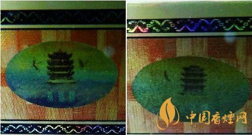 小盒商標紙側邊雙重全息定位燙技術差異比對:真品小盒側邊雙重全息定位燙技術的圖案由黃鶴樓實景照及黃鶴樓三個燙金字組合,切換不同角度會呈現(xiàn)出清晰較高全景圖案;假煙定位燙圖案多采用照相等仿造技術,無論如何切換不同角度都不能完整性呈現(xiàn)清晰圖案,與真品呈現(xiàn)效果差異明顯。
