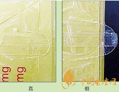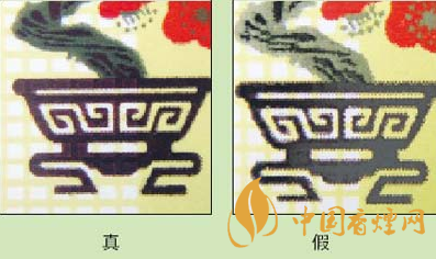3.看“花盆”圖案:真品卷煙的花盆為咖啡色,花盆底層的網格狀紋路隱約可見;假冒卷煙的花盆大多為黑色,顏色較深,看不到花盆底層的網格狀紋路。
