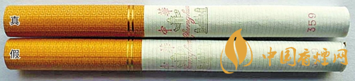 煙支印刷差異對比:真煙煙支過濾嘴上的兩個金色圓圈較寬;假煙煙支過濾嘴上的兩個金色圓圈較窄。
