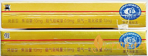 正面商標紙印刷工藝差異對比:真煙商標紙采用壓凸燙金工藝,中間天安門圖案用手摸凹凸感明顯,且天安門城墻上有細密的橫線條;假煙采用高清掃描仿制印刷,中間天安門圖案用手摸凹凸感不明顯,且天安門城墻上沒有橫線條。