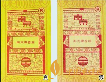 真煙條盒側面、小盒底部的老南京注冊商標圖案,紅色以外的底色部分發(fā)黃;假煙的老南京注冊商標圖案發(fā)白,圖案模糊。